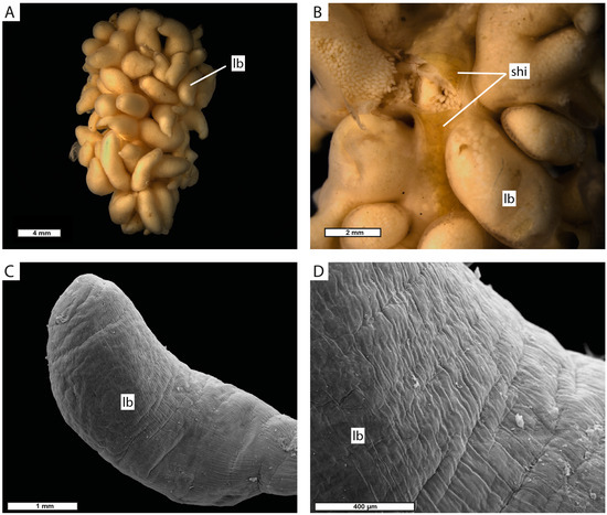 Externa of M. vancouverensis. (A) Whole externa “dorsal” view. (B) “Ventral” view to the central part of the interna. (C) General view of the externa lobe (SEM). (D) Fragment of externa lobe at higher magnification (SEM). lb, lobes of externa; shi, shield of the cuticle near the stalk.