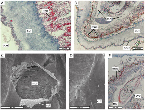 Morphology of externa lobes. (A,B) Histological transverse section of externa lobe. (C) Scanogram of the cuticle on the inner surface of the mantle cavity; in the center, the cuticle is damaged, and circular muscles are exposed. (D) Scanogram of the cuticle on the inner surface of the mantle cavity. (E) Histological section of cyprid larvae in the mantle cavity. cut, cuticle; cyp, cyprid larva; icut, the inner layer of cuticle; mc, mantle cavity; mus, muscular fibers; ocut, the outer layer of the cuticle.