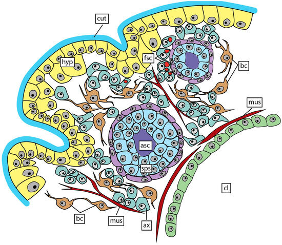 Scheme of the main trunk body wall. asc, aniline-stained content; ax, axial cells; cl, central lumen; bc, branched cells; cut, cuticle; fsc, cells with fuchsin-stained content; hyp, hypoderm; mus, muscular fibers; sps, spherical structure.