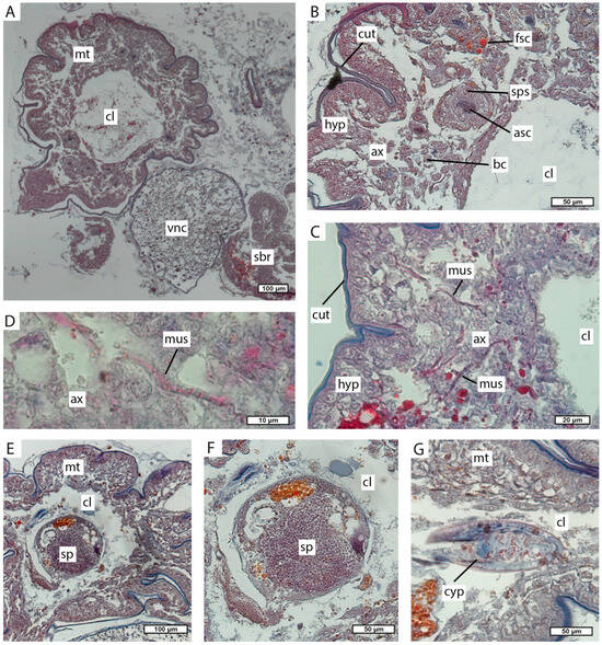 Histological sections of the main trunk. (A) Transverse section of the main trunk near the ventral nerve cord. (B–D) Transverse section of the body wall of the main trunk. (E,F) Spermatogenic bodies in the central lumen of the main trunk. (G) Transverse section of cyprid in the central lumen of the main trunk. asc, aniline-stained content; ax, axial cells; bc, branched cells; cl, central lumen; cyp, cyprid larva; fsc, cells with fuchsin-stained content; cut, cuticle; hyp, hypoderm; mt, main trunk; mus, muscular fibers; sbr, side branches; sp, spermatogenic bodies; sps, spherical structure; vnc, ventral nerve cord.