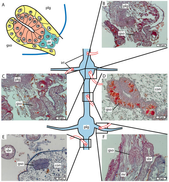 Invasive rootlets of M. vancouverensis interna. (A) Scheme of the goblet-shaped organs. (B,C) Goblet-shaped organs in pleonal ganglions. (D,E) Goblet-shaped organs in connectives. (F) Goblet-shaped organs in the segmental nerve. ax, axial cell layer; con, connectives; gso, goblet-shaped organs; irt, invasive rootlets; nv, segmental nerve; sbr, side branch (trophic rootlet); plg, pleonal ganglion.