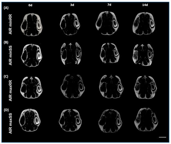 Micro-computed tomography (μCT) analysis of bone healing process kinetics in AIRminRR, AIRminSS and AIRmaxRR, AIRmaxSS (A–D). Samples from 8-week-old male or female mice were scanned with the μCT system (Skyscan 1174; Skyscan, Kontich, Belgium): evaluated at 0, 3, 7, and 14 days post-tooth extraction to evaluate the kinetics of the bone healing process. Images were reconstructed using the NRecon V1.6.9.8 software and three-dimensional images were obtained with the CT-Vox 2.3 software. The sectioned maxilla is represented at the coronal planes. The delimited area represents the bone healing process kinetics in mice.