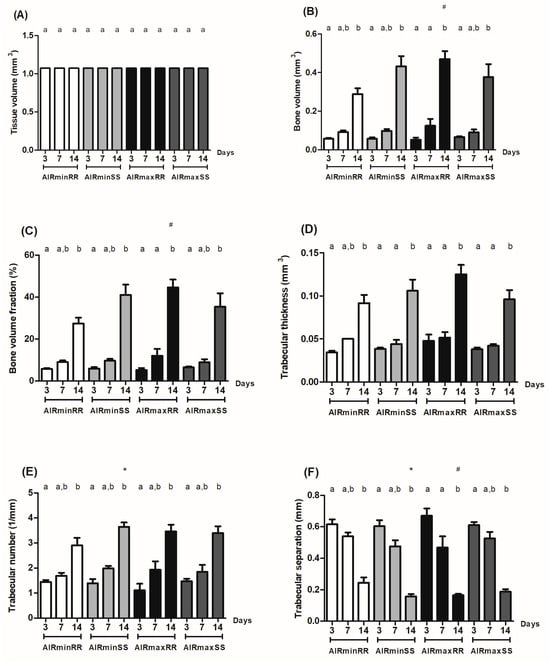 Morphological parameters of the trabecular bone microarchitecture in AIRminRR, AIRminSS, AIRmaxRR, and AIRmaxSS mice. Data were assessed using the CTAn 1.1.4.1 software from the cylindrical region of interest (ROI) determined by segmenting the trabecular bone located from the coronal to apical thirds. (A) Trabecular measurements analyzed included the tissue volume (TV), (B) bone volume (BV), (C) bone volume fraction (BV/TV %), (D) trabecular thickness (Tb.Th, mm), (E) trabecular number (Tb.N, mm), and (F) trabecular separation (Tb.Sp). * indicates significant statistical differences (p < 0.05) between the AIRminRR vs. AIRminSS and AIRmaxRR vs. AIRmaxSS groups, # indicates significant statistical differences (p < 0.05) between the AIRminRR vs. AIRmaxRR and AIRminSS vs. AIRmaxSS groups and different letters indicate significant statistical differences (p < 0.05) between the periods.