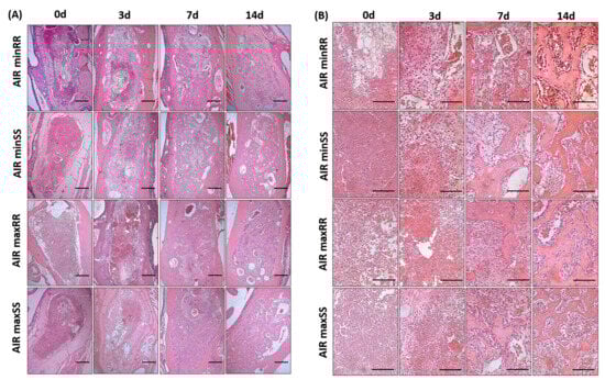 Histological aspects of the medial and apical thirds from tooth sockets in the bone healing process. Representative sections of the alveolar bone healing kinetics at 0-, 3-, 7- and 14-days post-extraction of the upper right incisor in AIRminRR, AIRminSS, AIRmaxRR, and AIRmaxSS mice. HE staining, (A) original magnification 10× and (B) original magnification 40×. Bar = 100 μm.
