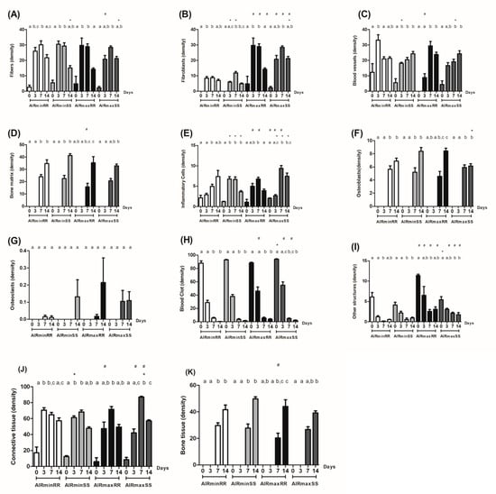 Histomorphometric analysis of alveolar bone healing kinetics after tooth extraction. Results are presented as the means (±SD) of density for each structure of the alveolar socket. (A) fiber, (B) fibroblasts, (C) blood vessels, (D) bone matrix, (E) inflammatory cells, (F) osteoblast, (G) osteoclasts, (H) blood clot, (I) other components (empty space left by the inflammatory exudate or intercellular liquid), (J) total density of connective tissue (represented by the sum of fibers, fibroblasts, blood vessels, and inflammatory cells) and (K) bone tissue (represented by the sum of its structural components bone matrix, osteoblasts and osteoclasts). * indicates significant statistical differences (p < 0.05) between the AIRminRR vs. AIRminSS and AIRmaxRR vs. AIRmaxSS groups, # indicate significant statistical differences (p < 0.05) between the AIRminRR vs. AIRmaxRR and AIRminSS vs. AIRmaxSS groups and different letters indicate significant statistical differences (p < 0.05) between the periods.