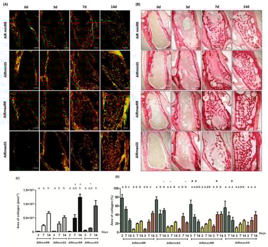 Quantification of birefringent fibers by the picrosirius-polarization method in the bone healing process after tooth extraction. Representative sections of picrosirius red staining visualized upon polarized (A,B) to identify collagen fibers types at 0, 3, 7 and 14 days post-extraction of the upper right incisor. Green birefringence color indicates thin fibers; yellow and red colors in the birefringence analysis indicate thick collagen fibers. Original magnification 10×. Bar = 100 μm. Intensity of birefringence was measured with the Image-analysis software (AxioVision 4.8 softwareCarl Zeiss, Oberkochen, Germany) for identification and quantification; (C) total area of collagen fibers (pixel2) and (D) area of collagen from each birefringence color (%). Results are presented as the mean (±SEM) of pixels2 for each color in the birefringence analysis in the bone healing at 0-, 3-, 7- and 14-days post-extraction. * indicates significant statistical differences (p < 0.05) between the AIRminRR vs. AIRminSS and AIRmaxRR vs. AIRmaxSS groups, # indicates significant statistical differences (p < 0.05) between the AIRminRR vs. AIRmaxRR and AIRminSS vs. AIRmaxSS groups and different letters indicate significant statistical differences (p < 0.05) between the periods.