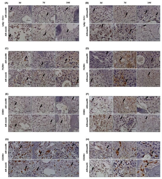 Immunohistochemistry analysis for (A,B) GR1+, (C,D) F4/80+, (E,F) CD80+ and (G,H) CD206+ cells present in the bone repair process in the AIRminRR, AIRminSS and AIRmaxRR, AIRmaxSS mice. Representative sections from medial thirds of the socket at days 3, 7 and 14 days after tooth extraction. Indirect staining MACH4+ DAB, anti-staining Mayer hematoxylin; objective of 100×. The arrows indicate the immunolabeled cells.