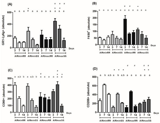 Analysis of inflammatory cells in the alveolar bone healing kinetics after tooth extraction in AIRminRR, AIRminSS and AIRmaxRR, AIRmaxSS. (A) Immunohistochemistry quantification corresponding to Ly6g-Gr1+ immunolabelled with Ly6g-Gr1+, (B) F4/80+ immunolabelled with anti-F4/80+, (C) CD80+ immunolabelled with anti-CD80+ and (D) CD206+ immunolabelled with anti-CD206. Results are presented as the means (±SEM) and * indicates significant statistical differences (p < 0.05) between the AIRminRR vs. AIRminSS and AIRmaxRR vs. AIRmaxSS groups, # indicates significant statistical differences (p < 0.05) between the AIRminRR vs. AIRmaxRR and AIRminSS vs. AIRmaxSS groups and different letters indicate significant statistical differences (p < 0.05) between the periods.
