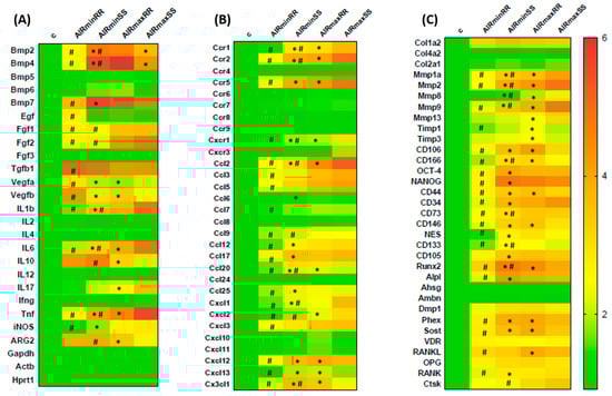Molecular analysis (PCRArray) using a heat map to quantify the expression of (A) growth factors and cytokine markers, (B) extracellular matrix markers and (C) bone markers in bone healing process among AIRminRR, AIRminSS and AIRmaxRR, AIRmaxSS, post-extraction. PCRArray of pooled samples. Results were obtained when comparing the relative expression of the different groups to the normalizing control and * indicates significant statistical differences (p < 0.05) between the AIRminRR vs. AIRminSS and AIRmaxRR vs. AIRmaxSS groups, # indicates significant statistical differences (p < 0.05) between the AIRminRR vs. AIRmaxRR and AIRminSS vs. AIRmaxSS groups.