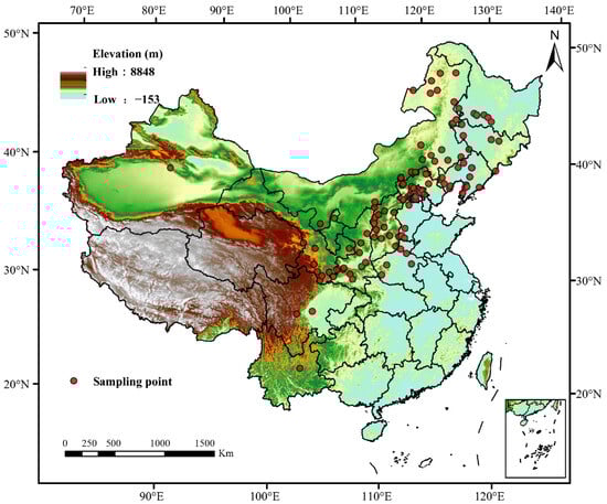 Mountain apricot distribution point data in China were retrieved using the global bioinformation platform (GBIF, https://www.gbif.org/), and 309 records were collected. The data were then collated regarding species names, longitude and latitude. To make the prediction results more accurate, we removed redundant data and duplicate data from the data using the ENMTools (https://github.com/danlwarren/ENMTools, last accessed on 27 March 2024) program. Finally, the effective distribution point data of 132 items of mountain apricots were obtained (Figure 1).