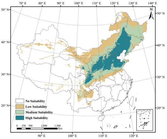 Suitable distribution area of Prunus sibirica by MaxEnt in China.