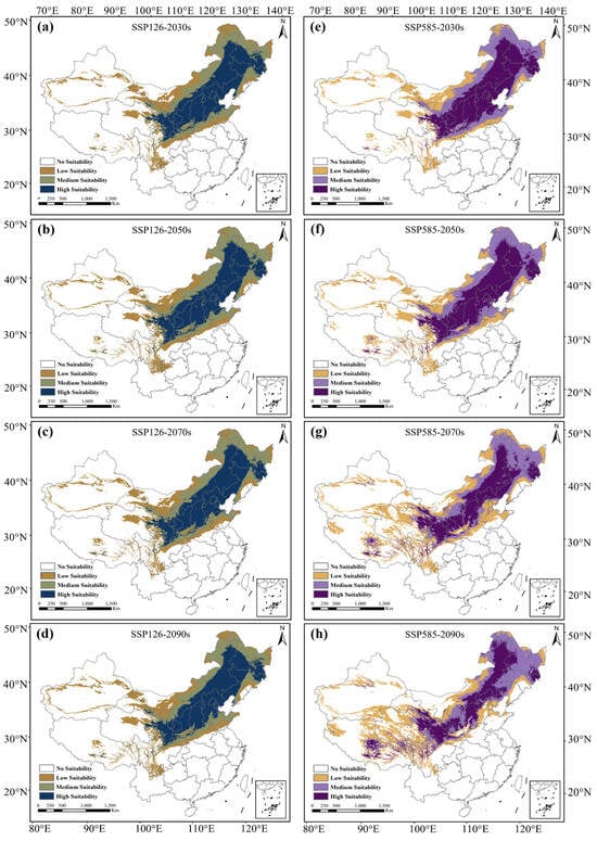 Suitable distribution area for Prunus sibirica in China in the future under different climate change scenarios. (a) Suitable distribution area for Prunus sibirica in China under SSP126−2030s scenario; (b) SSP126−2050s; (c) SSP126−2070s; (d) SSP126−2090s; (e) SSP585−2030s; (f) SSP585−2050s; (g) SSP585−2070s; (h) SSP585−2090s.