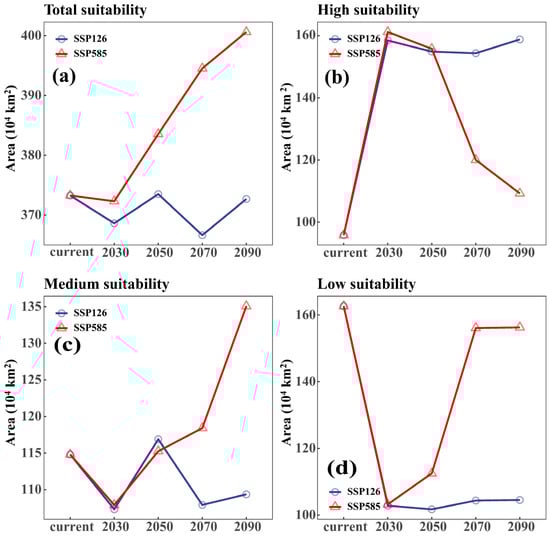 We also compared the area changes in the suitable distribution area between the two climate models. In the low emission mode of SSPs126, the change in the area of the suitable distribution was relatively stable. After the 2090s, the total suitable area would decrease by 5860 km2 (0.16%), but in the high emission mode of SSPs585, the total area of the suitable distribution area shows an increasing trend year by year. After 2090s, the total suitable area would increase by 273,459 km2 (7.33%) (Figure 4a). Moreover, area fluctuations in high-, moderate- and low-suitability areas are mainly concentrated in current–30s in the low emission mode (SSPs126), and maintain relative stability at 30s–90s. And the change values were 65.76%, −4.75% and −35.74%, respectively, by the 2090s and later. Area fluctuations in the high-, moderate- and low-suitability regions are similarly concentrated in current–30s in the high emission mode (SSPs585), but the high- and low-suitability regions would gradually tend towards current levels after significant changes in the 30s. By the 2090s and later, change values would be 14.02% and −3.91%, respectively. The moderate area would increase after the 30s, and would increase by 17.65% by the 2090s and later (Figure 4b–d).