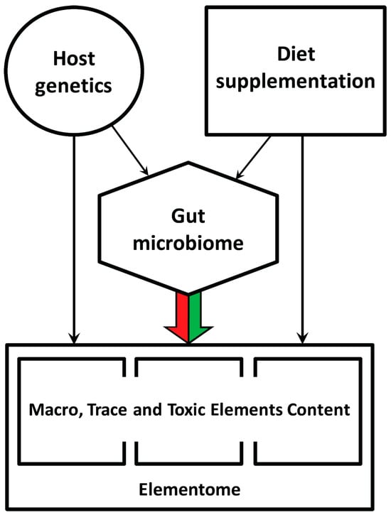 Notably, variations in elemental concentrations in broiler chicken liver and meat samples were highly correlated and stratified, with three typical compositions termed “elementomes” and defined as the content of all (or at least most) macro, trace and toxic elements [39]. The observed α-elementome was characterized by a high content of macro elements (Na, K, Mg, Ca, P), majority trace elements (Sr, Se, Mn, Fe, Co, Cu, Zn) and some toxic elements (B, Pb, Ni, Cd). The alternative β-elementome showed high accumulation of Si, V and Cr with decreased concentrations of most of the macro, trace and toxic elements mentioned above. In turn, the γ-elementome has an increased content of Li and a number of toxic elements (Al, As and Hg). In controlled experiments, these variations could not be explained by differences in host genetics or dietary supplementation; therefore, our attention was focused on the gut microbiome, which plays a significant role in macro, trace and toxic element metabolism in animals [19] and humans [22].