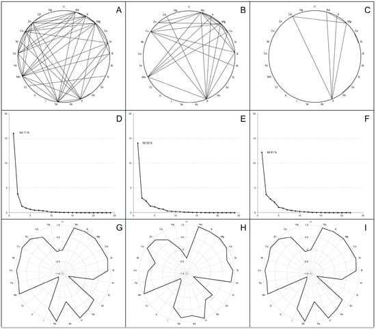 Correlation analysis (A–C), principal component analysis (D–F) and first component structure (G–I) among the examined elements in the livers (A,D,G), thigh muscles (B,E,H) and breast muscles (C,F,I) in broiler chickens. Parts (A–C) indicate the strong positive correlations between elements (r ≥ 0.9). Parts (D–F) present scree plots where the x-axis is the component number and the y-axis is the component eigenvalue. Parts (G–I) show factor loadings (between +1.0 and −1.0) for examined elements in the first principal component (F1).
