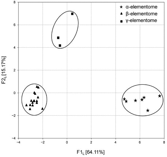 The calculation of factor scores made it possible to link the analyzed groups with the F1 factor directly or inversely. In turn, the projection of the macro, trace and toxic element compositions of broiler chicken biosamples onto the F1 × F2 factor plane showed that elemental variation is generally stratified, not continuous. For example, Figure 3 shows three robust clusters of chicken liver samples, which differ significantly from each other in elemental content, and according to Peñuelas et al. (2019) [39] these are called “elementomes”.