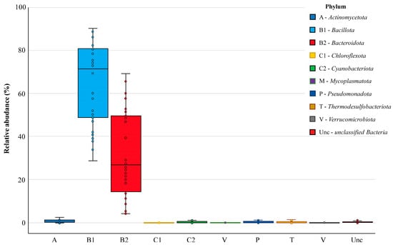 Nine bacterial phyla were found in the chicken cecal microbiomes, defined as monophyletic lineages of bacteria. Their 16S rRNA genes have a pairwise sequence identity of approximately 75% or less with those of other bacterial phyla. At this highest taxonomic level, the prevalent phyla in all groups were Bacillota and Bacteroidota, which occurred in 100% of cecal samples and showed relative abundances in the bacterial community of 71.45% [49.24–80.64] and 26.81% [14.27–49.51], respectively (Figure 4). Resident members of the core chicken cecal microbiomes also included the phyla Actinomycetota, Cyanobacteriota, Pseudomonadota and Thermodesulfobacteriota, which were present in at least two-thirds of the analyzed samples but showed low abundance (less than 1%). Three more phyla (Chloroflexota, Mycoplasmatota and Verrucomicrobiota) were found sporadically. In turn, about 0.23% [0.06–0.44] of operational taxonomic units could not be correctly characterized in terms of phylum definition and were therefore assessed as unclassified bacteria.