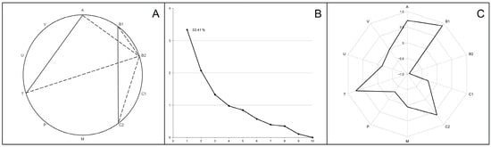 Correlation analysis (A), principal component analysis (B) and first component structure (C) characterizing the cecal microbiome composition in broiler chickens. Part A shows statistically significant (p < 0.001) bacterial phyla co-occurrence, with positive correlations in solid lines and negative correlations in dotted lines. Part B presents scree plots where the x-axis is the component number and the y-axis is the component eigenvalue. Part C indicates factor loadings (between +1.0 and −1.0) for occurred bacterial phyla in the first principal component. Bacterial phyla designations: A—Actinomycetota; B1—Bacillota; B2—Bacteroidota; C1—Chloroflexota; C2—Cyanobacteriota; M—Mycoplasmatota; P—Pseudomonadota; T—Thermodesulfobacteriota; V—Verrucomicrobiota; Unc—unclassified Bacteria.