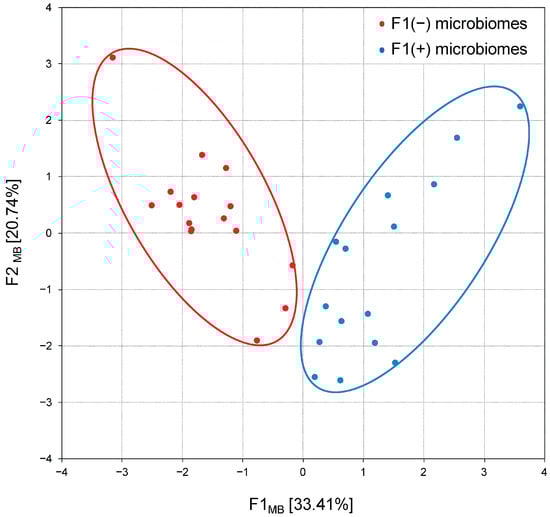 Projection of the cecal microbiome compositions (patterns) in broiler chickens on the F1MB × F2MB factor plane, assessed using principal component analysis. F1(−) microbiomes represent Bacteroidota-enriched cecal microbial communities; F1(+) microbiomes represent Bacillota + ACT (Actinomycetota, Cyanobacteriota and Thermodesulfobacteriota) cecal microbial communities.