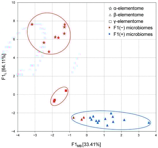 In the next step, the distribution of complete data sets was analyzed via their projection onto the F1 microbiome × F1 elementome factor plane. As shown in Figure 7, in chicken liver samples, a clear relationship was established between the previously described Bacteroidota-enriched and Bacillota + ACT cecal microbiome and macro, trace and toxic element compositions, designated as α-, β- and γ-elementomes. All α-elementomes (enriched with macro elements Na, K, Mg, Ca, P; majority trace elements—Sr, Se, Mn, Fe, Co, Cu, Zn; and some toxic elements—B, Pb, Ni, Cd) and γ-elementomes (increased in Li, Al, As and Hg content) were strictly related to Bacteroidota-enriched microbiomes. In turn, most β-elementomes demonstrated decreases in the contents of most macro, trace and toxic elements but were enriched in Si, V and Cr, associated with Bacillota + ACT microbiomes, while several groups characterized by F1MB values from 0 to −1 were formally related to the F1(−) microbiome pattern. Very similar distributions were also stated for meat samples where minor variations were determined by differences in the thigh and breast elementomes, optionally including or excluding some trace and toxic elements.