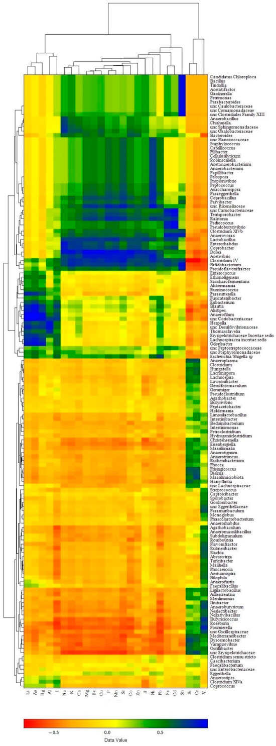 In the liver samples (Figure 8), the clusters of elements were as follows: (i) a composition of macro elements (Na, K, Mg, Ca, P) with majority trace elements (Sr, Se, Mn, Fe, Co, Cu, Zn) and some toxic elements (B, Sn, Pb, Ni, Cd), which corresponded well with the α-elementome; (ii) a cluster of Li, I and three toxic elements, As, Al, Hg, similar to the γ-elementome; (iii) Si, V and Cr compositions equivalent to the β-elementome. In turn, the bacterial genera showed clusters corresponding to the preferential accumulation or exclusion of elements present in the clusters (elementomes) described above. The bacterial cluster associated with the accumulation of most macro, trace and toxic elements included 47 taxa (40 classified at the genus level and 7 at the family level), among which the most abundant genus was Bacteroides, while the top 10 significant influencers were Acetivibrio, Anaerobacterium, Anaerovorax, Clostridium IV, Coprobacter, Dorea and Lactobacillus (belonging to the phylum Bacillota) and Bifidobacterium (phylum Actinomycetota), Ralstonia (phylum Pseudomonadota) and unclassified Rikenellaceae (phylum Bacteroidota), with each having an r value more than 0.7 (p < 0.001) for at least 10 elements. The cluster associated with the accumulation of Li, I. As, Al and Hg consisted of 17 genera and 4 bacterial taxa classified to the family level, including Alistipes (the most abundant genus in the cluster) and Odoribacter, both belonging to the phylum Bacteroidota, as well as Anaerofilum, Blautia, Erysipelotrichaceae Incertae sedis, Hespellia, Lachnospiracea incertae sedis (phylum Bacillota), Parasutterella (phylum Pseudomonadota), unclassified members of the families Coriobacteriaceae (phylum Actinomycetota) and Desulfovibrionaceae (phylum Thermodesulfobacteriota), which significantly increased the content of at least three of the five elements. The most numerous bacterial cluster was associated with the accumulation of Si, V and Cr and included 71 taxa; among them, Butyrococcus was the most abundant, and Dielma, Dysosmobacter, Frisingicoccus and unclassified Erysipelotrichaceae all belonging exclusively to the phylum Bacillota were the most significant influencers, while most of the other genera changed the content of only one named element. Another closely related subcluster was indifferent to the accumulation of elements and consisted of eight bacterial taxa, including the genera Anaerostipes, Caecibacterium, Clostridium sensu stricto, Clostridium XlVa, Coprococcus, Eggerthella, Faecalibacterium and unclassified members of the family Enterobacteriaceae.