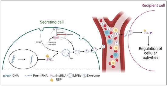 The biogenesis of exosomes through both endosomal sorting complex required for transport (ESCRT)-dependent and -independent pathways has been extensively reviewed in previous studies [36,37,38]. Therefore, this chapter will focus on the incorporation of lncRNAs into exosomes. The cellular milieu significantly influences the selection and incorporation of lncRNAs into exosomes, leading to the generation of exosomes that exhibit distinct lncRNA profiles shaped by cellular conditions. The sphingomyelin cycle, an alternative pathway to ESCRT, is essential in the biogenesis of ceramide-enriched exosomes and cargo sorting [39]. In this cycle, sphingomyelin is converted by sphingomyelinases into ceramide and phosphorylcholine, with ceramide further metabolized into sphingosine and sphingosine-1-phosphate [40,41]. Targeting this pathway through gene silencing or the neutral sphingomyelinase-2 inhibitor GW4869 can significantly disrupt exosomal biogenesis, cargo packaging, and release [42]. Saliently, according to Kong et al., treating human adipose-derived stem cells with GW4869 can also decrease the levels of the exo-lncRNA MALAT-1, while the stimulation of ceramide synthesis using C2- and C6-short-chain ceramides results in its upregulation [43], indicating its involvement in packaging lncRNAs.