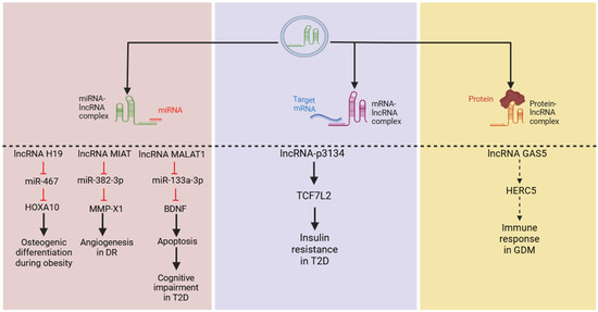 LncRNAs employ various mechanisms to regulate cellular activities, including targeting microRNAs (miRNAs), messenger RNAs (mRNAs), and proteins, all of which have been reported in metabolic diseases. From left to right, lncRNAs H19, MIAT, and MALAT1 have been shown to act through a classical pathway by binding to miRNAs to regulate their downstream targets. Additionally, lncRNA-p3134 may upregulate TCF7L2 (mechanism not clear) to mediate insulin sensitivity, while GAS5 has been predicted to dock with the HERC5 protein to induce GDM. (Abbreviations: long non-coding RNA (lncRNA); transcription factor 7-like 2 (TCF7L2); HECT and RLD domain-containing E3 ubiquitin protein ligase 5 (HERC5); gestational diabetes mellitus (GDM); diabetic retinopathy (DR); type 2 diabetes (T2D).)