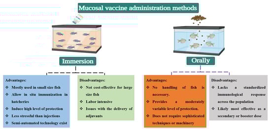 Immersion vaccination involves immersing fish in a solution containing the vaccine. It is particularly effective for small or juvenile fish and is commonly used in hatcheries [147]. This method allows antigens to contact the skin, gills, and possibly the gut mucosa, inducing a localized immune response [148]. The drawbacks of this method include its limited applicability for large fish in open sea cages, a shorter duration of immune response, and the potential variability in the dose received by each fish [149]. Additionally, antigen uptake via the immersion route is considerably affected by various factors, including the duration of vaccine exposure, total biomass, fish age, and the pH and salinity of the immersion water [150]. Oral vaccination involves incorporating vaccines into feed, allowing for easy mass administration. Microencapsulation and mucoadhesive nanoparticles represent innovative strategies to boost oral vaccine efficacy by shielding antigens from the harsh digestive environment and enabling their targeted release in the gut. This targeted delivery allows antigens to interact effectively with gut-associated lymphoid tissue (GALT), thereby inducing both systemic and mucosal immunity [86,151]. However, challenges such as antigen degradation in the digestive tract and variable uptake between individual fish limit the effectiveness of this method [11]. A summary of various administration routes for mucosal vaccines, along with their respective advantages and disadvantages, is provided in Figure 2.