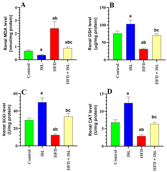 Levels of malondialdehyde (MDA) (A), glutathione (GSH) (B) and total levels of superoxide dismutase (SOD) (C) and catalase (D) in the kidneys of all groups of rats. Data are presented as means ± SD (n = 8/group). The values were significantly different at p < 0.05. a: significantly different compared with control; b: significantly different compared with ISL-treated rats (20 mg/kg); c: significantly different compared with HFD-treated rats. MDA: malondialdehyde; SOD: superoxide dismutase; GSH: total glutathione; and CAT: catalase.