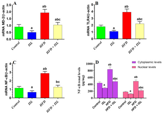 mRNA levels of MD-2 (A), TR4 (B), and NF-κB (C) as well as renal cytoplasmic and nuclear levels of NF-κB p65 (D) in all experimental groups of the study. Data are presented as means ± SD (n = 8/group). The values were significantly different at p < 0.05. a: significantly different compared with control; b: significantly different compared with ISL-treated rats (20 mg/kg); c: significantly different compared with HFD-treated rats.