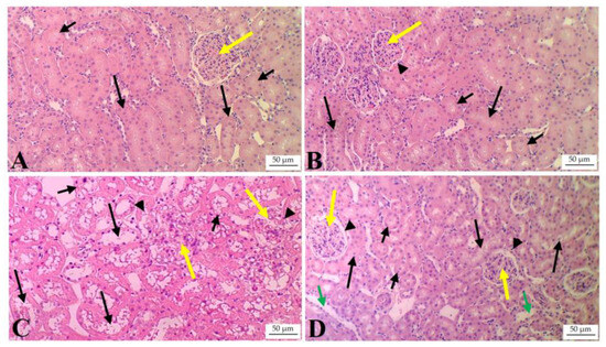 Histological images of the kidneys of all groups of rats. (A,B) were taken from control and ISL-treated rats and showed normal glomeruli (yellow arrow) with a normal-sized glomerular space and basement membrane (black arrowhead). Most proximal convoluted tubules (PCTs) (short black arrow) and distal convoluted tubules (DCTs) (long black arrow) were normal. (C) was taken from HFD-fed rats and showed abnormal glomerular shapes, with glomerular shrinkage; damaged, shrunk capillaries (yellow arrow); and damaged glomerular capsule (black arrowhead). The kidneys of this group of rats also showed severe degeneration and vacuolization in the PCTs (short black arrow) and DCTs (long black arrow). (D) was taken from HFD + ISL-treated rats and showed an almost normal glomerular shape (yellow arrow) and normally sized basement membrane (black arrowhead). The majority of the PCTs and DCTs had intact structures (short and long arrows, respectively). Tubular degeneration remained visible in some DCTs (short green arrow).