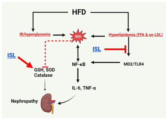 Graphical abstract demonstrating the precise nephroprotective effect of ISL against HFD-mediated nephropathy in HFD rats. ISL could suppress the generation of ROS by increasing the levels of antioxidants such as glutathione (GSH), superoxide dismutase (SOD), and catalase. In addition, ISL was able to suppress the activation of NF-kB by downregulating the MD2/TLR4, probably through its hypolipidemic and antioxidant effects, which decrease the generation of free fatty acids (FFAs) and the oxidized LDL cholesterols (ox-LDLs).