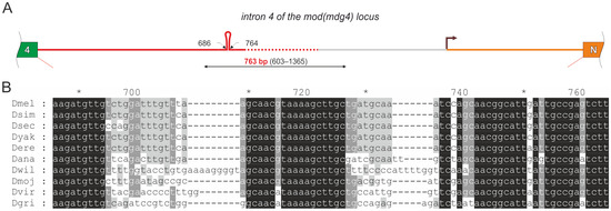 (A) The structure of the fourth intron of the mod(mdg4) gene in Drosophila melanogaster. Non-canonical termination of transcription occurs within this intron, producing transcripts that lack a poly(A) tail. The resulting pool of transcripts does not exhibit a defined boundary at the 3′ end (indicated by the red dashed line). The gray line denotes the region where transcription is absent. The 763 bp fragment (indicated by the black double arrow) is responsible for inducing non-canonical termination of transcription [11]. A conserved sequence that forms a secondary structure occurs within the region 686–764. The fourth constitutive exon is marked in green. The annotated promoter of the alternative acceptor exon N (shown in orange) is indicated by the arrow. (B) Alignment of the core sequence from 686 to 764 bp with homologous fragments of introns from various species within the Drosophilidae family. The top row provides coordinates relative to the start of intron 4 in D. melanogaster, with every 10th position marked by a number or an asterisk (*).