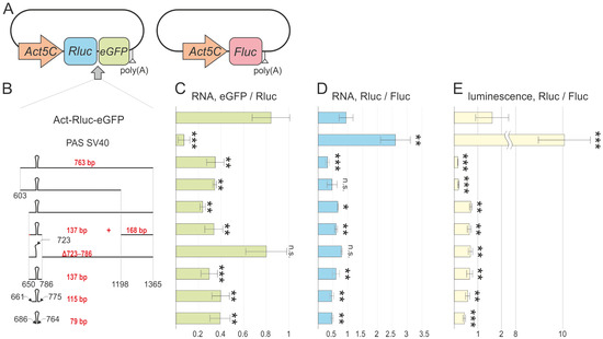(A) A model system for evaluating the ability of DNA sequences to initiate the termination of transcription. The Rluc and eGFP genes are located within the same transcription unit under the control of an actin promoter. DNA fragments were inserted between the Rluc and eGFP genes for assessment. A plasmid containing the Fluc gene under the control of the Act5C promoter was co-transfected with the experimental construct for normalization. (B) Schematic representations of deletion derivatives of the original fragment assessed for their ability to induce transcription termination. A control vector without the elements (Act-Rluc-eGFP) and with the SV40 polyadenylation signal was used. The ratios of the transcript levels of eGFP to Rluc (C) and Rluc to Fluc (D) and the luminescence ratios of Rluc to Fluc (E) were measured. Each measurement was conducted at least three times, and the error bars represent standard deviations. The asterisks indicate the levels of statistical significance, ** p < 0.01 and *** p < 0.001, non-significant (n.s.) p > 0.05, with comparisons made against the control construct Act-Rluc-eGFP.