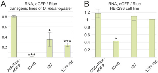 Evaluation of two fragments containing an NTT for their ability to induce the termination of transcription (A) within the D. melanogaster genome and (B) in human HEK293 cells. The ratios of eGFP to Rluc transcript levels are presented. Each measurement was conducted at least three times, and the error bars represent standard deviations. The asterisks denote levels of statistical significance, * p < 0.05, *** p < 0.001, with comparisons made against the control construct Rluc-eGFP.