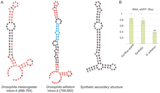 (A) RNA secondary structures of the NTT from D. melanogaster and D. willistoni and an artificial synthetic structure. Conserved regions among Drosophilidae (highlighted in red) form the hairpin base, loop, and supporting stem. Non-conserved regions of the RNA structure in D. willistoni are shown in blue. (B) Evaluation of the artificial synthetic structure and the NTT from D. willistoni for their ability to induce the termination of transcription in a model system. The ratio of eGFP to Rluc transcript levels is shown. Each measurement was conducted at least three times, and the error bars represent standard deviations. The asterisks indicate levels of statistical significance, ** p < 0.01, with comparisons made against the control construct Act-Rluc-eGFP.