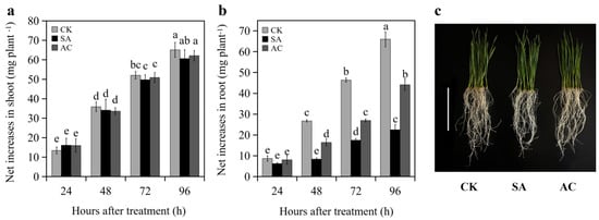 Net increase in (a) shoot and (b) root fresh weight (mean ± SD) of wheat seedlings at 24, 48, 72, and 96 h after treatment, and (c) seedling phenotype grown with different treatments at 48 h. Different letters above columns indicate significant differences between treatments at p ≤ 0.05. In (c), bar = 10 cm. Wheat seedlings were treated with 7.5 mM NO3− (CK), 7.5 mM NH4+ (SA), or 7.5 mM NH4+ + 3 mM HCO3− (AC).