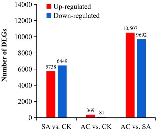 Paired comparisons of DEGs between N treatments. Red and blue represent up- and downregulated expression, respectively. Wheat seedlings were treated with 7.5 mM NO3− (CK), 7.5 mM NH4+ (SA), or 7.5 mM NH4+ + 3 mM HCO3− (AC).