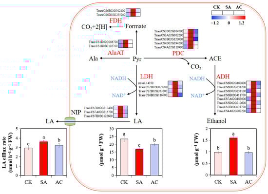 The expression of fermentation transcripts, PDC, ADH, LDH, alanine aminotransferase (AlaAT), and NAD-dependent formate dehydrogenase (FDH) was upregulated under SA treatment at 48 h compared with CK. However, under AC treatment, the expression of these DEGs was significantly downregulated compared with SA treatment (Figure 3).