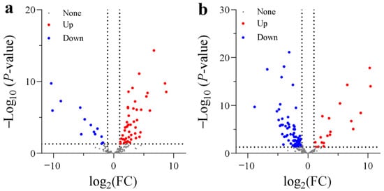 Volcano plots of DEGs encoding dioxygenases: (a) SA vs. CK; (b) AC vs. SA. Wheat seedlings were treated with 7.5 mM NO3− (CK), 7.5 mM NH4+ (SA), or 7.5 mM NH4+ + 3 mM HCO3− (AC). Red and blue dots indicate upregulated and downregulated DEGs, respectively, and gray dots indicate genes that were not differentially expressed. Images were created using GraphPad Prism 9.4.1.