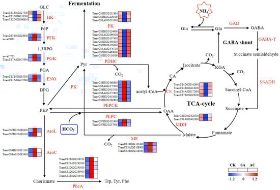 Glycolysis and TCA cycle pathways overrepresented among differentially expressed genes and significantly changed metabolites. Color gradient indicates expression levels of DEGs from low (blue) to high (red). Wheat seedlings were treated with7.5 mM NO3− (CK), 7.5 mM NH4+ (SA), or 7.5 mM NH4+ + 3 mM HCO3− (AC). AroC, chorismate synthetase; AroL, shikimate kinase; BPG, bisphosphoglycerate; 1,3 BPG, 1,3-bisphosphoglycerate; CA, citrate; CS, citrate synthase; ENO, enolase; F6P, fructose-6-phosphate; GABA, γ-aminobutyric acid; GABA-T, GABA transaminase; GAD, glutamate decarboxylase; GLC, glucose; Gln, glutamine; Glu, glutamate; HK, hexokinase; KGA, α-ketoglutarate; MDH, malate dehydrogenase; ME, malic enzyme; OAA, oxaloacetic acid; PDHC, pyruvate dehydrogenase complex; PEP, phosphoenolpyruvate; PEPC, phosphoenolpyruvate carboxylase; PEPCK, phosphoenolpyruvate carboxylase kinase; PFK, phosphofructokinase; PGA, 3-phosphoglycerate; PGK, phosphoglycerate kinase; Phe, phenylalanine; PheA, prephenate dehydratase; PK, pyruvate kinase; Pyr, pyruvate; SSADH, succinate-semialdehyde dehydrogenase; Trp, tryptophan; Tyr, tyrosine.