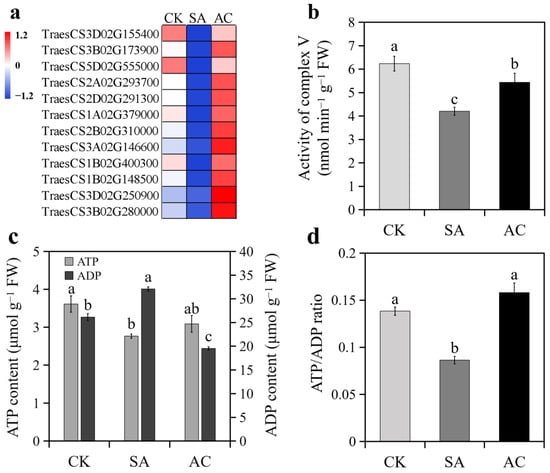 Effects of N treatments on ATP synthesis in roots of wheat seedlings: (a) expression of DEGs encoding ATP synthases; (b) activity of root complex V; (c) ATP and ADP content; (d) ratio of ATP to ADP. Values represent mean ± SD from three independent biological replicates. Different lowercase letters above columns indicate significant differences at p < 0.05. Wheat seedlings were treated with 7.5 mM NO3− (CK), 7.5 mM NH4+ (SA), or 7.5 mM NH4+ + 3 mM HCO3− (AC).