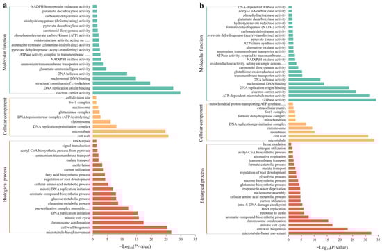 GO analysis of DEGs under different N treatments: (a) SA vs. CK; (b) AC vs. SA. X-axis indicates −Log10 (p-value), and Y-axis is enriched GO terms.