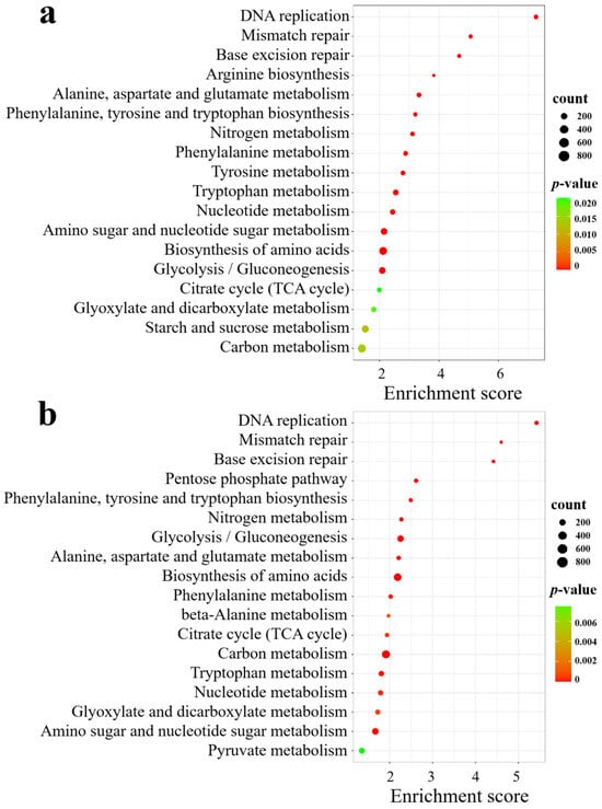 KEGG analysis revealed that in SA vs. CK, the significantly enriched pathways included DNA replication; amino acid biosynthesis; alanine, aspartate, and glutamate metabolism; amino sugar and nucleotide sugar metabolism; nitrogen metabolism; glycolysis/gluconeogenesis; starch and sucrose metabolism; carbon metabolism; and the citrate cycle (TCA cycle) (Figure 8a). In AC vs. SA, the pathways were mainly clustered in DNA replication; amino acid biosynthesis; carbon metabolism; glycolysis/gluconeogenesis; the pentose phosphate pathway; nitrogen metabolism; alanine, aspartate, and glutamate metabolism; amino sugar and nucleotide sugar metabolism; nucleotide metabolism; the citrate cycle (TCA cycle); beta-alanine metabolism; and pyruvate metabolism (Figure 8b). These results indicate that an array of physiological processes in wheat roots are affected by NH4+ stress.
