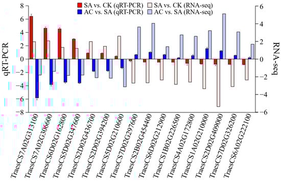 RNA-Seq data accuracy verification. Column represents 2−ΔΔcq value of qRT-PCR analysis and log2(FC) value of RNA-Seq. Values represent mean ± SD. Positive values on Y-axis indicate upregulation of hub genes, and negative values indicate downregulation. Wheat seedlings were treated with 7.5 mM NO3− (CK), 7.5 mM NH4+ (SA), or 7.5 mM NH4+ + 3 mM HCO3− (AC).