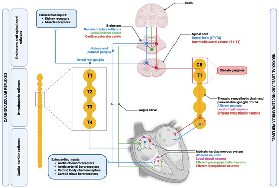 Our understanding of cardiac neuronal control, albeit still far from being complete, has dramatically evolved in the last decades. One of the turning points has been the realization that beat-to-beat reflex control of cardiac function goes far beyond a purely descendant central command due to the existence of peripheral, subcortical pathways including all the elements of neuronal arches, namely afferent neurons, interneurons (or local circuits neurons) and efferent neurons. The first hierarchy of these neuronal networks is located within the epicardial fat pads [1], and it is better known as the intrinsic cardiac nervous system (ICNS) [2,3]. The second one is located within extracardiac but intrathoracic ganglia, such as the cervical ganglia and the stellate ganglia, while the third one involves central neuronal stations (medullary and spinal cord neurons modulated by higher centers) [3]. The entire cardiac neuraxis can be imagined as a multiple-level powerhouse that continuously receives and integrates cardiac and extra-cardiac afferent inputs and uses them to generate a double (sympathetic and parasympathetic) autonomic output that finely modulates all cardiac functions. This neuronal control system shows plasticity and memory capacity and plays a pivotal role in the maintenance of cardiac homeostasis, as well as in the development and progression of cardiac pathology.
