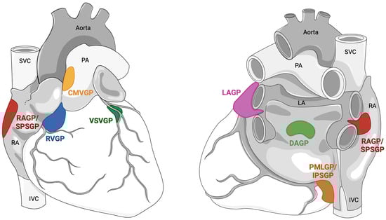The anatomical distribution of GPs is different across species: they are less scattered and have a lower innervation density in smaller animals (e.g., mice and rats) compared to larger ones (e.g., rabbits, sheep, pigs and dogs) [62,63]. In larger mammals, including humans, the GPs can be located in seven subregions: dorsal right atrial, ventral right atrial, ventral left atrial, left dorsal, middle dorsal, right coronary and left coronary [62,63]. GPs are mostly (75%) found on the posterior atrial surface; the remaining are located at the transition from atria to the ventricle at the level of the tricuspid and bicuspid valves, in the annular-ventricular region, on the anterior surface of the heart. There are four GPs located in the vicinity of the pulmonary veins (PVs, Figure 2): each one of them innervates the PVs and the surrounding left atrial myocardium.