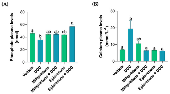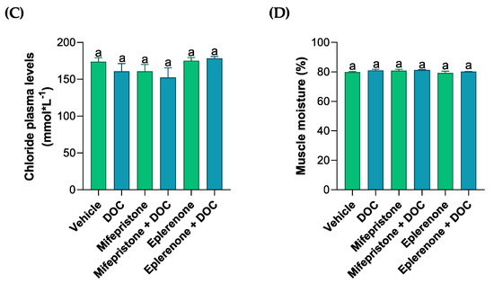 The plasma phosphate, calcium, chloride, and muscle water content of the rainbow trout. The phosphate (A), calcium (B), and chloride (C) plasma levels, as well as the (D) muscle water content, were measured in the fish treated with the vehicle, DOC, mifepristone, mifepristone + DOC, eplerenone, and eplerenone + DOC. The results are expressed as the means ± standard error of the means (SEM) (n = 5). Different letters represent the significant differences (p < 0.05) present when groups were compared.