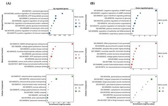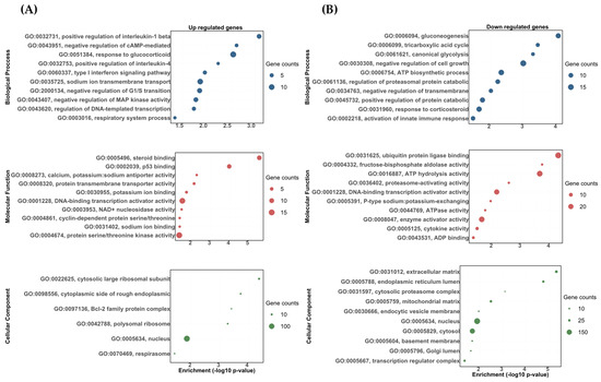 The gene ontology biological process (BP), molecular function (MF), and cellular component (CC) enrichment of the differentially expressed transcripts between the DOC vs. eplerenone + DOC treatments. (A) Upregulated DETs. (B) Downregulated DETs. The graph indicates the −log10(p-value) that was enriched by the differentially expressed transcripts between the group DOC vs. eplerenone + DOC with a padj of <0.05.