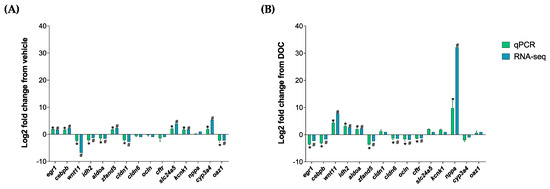 RNA-seq analysis validation via a real-time PCR of the DETs. The following DETs were selected for the real time-PCR validation of the RNA-seq process: egr1, cebpb, wnt11, idh2, aldoa, zfand5, cldn1, cldn6, ocln, cftr, slc24a5, kcnk1, nppa, cyp3a4, and oaz1. (A) Validation results between the vehicle vs. DOC and (B) the DOC vs. eplerenone + DOC. For the RNA-seq, “#” in blue indicates a padj of <0.05 and an absolute Log2FC of >1. For the real-time PCR (n = 3), the relative expression was normalized against actβ and fau, and the “*” in green indicates the significant differences in the fold change in the vehicle or DOC groups (mean ± SEM, n = 3, p < 0.05). The genes had the following abbreviations: egr1 (early growth response 1); cebpb (CCAAT enhancer binding protein beta); wnt11 (Wnt family member 11); idh2 (isocitrate dehydrogenase (NADP(+)) 2); aldoa (aldolase, fructose-bisphosphate A); zfand5 (zinc finger AN1-type containing 5); cldn1 (claudin 1); cldn6 (claudin 6); ocln (occludin); cftr (cystic fibrosis transmembrane conductance regulator); slc24a5 (solute carrier family 24 member 5); kcnk1 (potassium two-pore domain channel subfamily K member 1); nppa (natriuretic peptide A); cyp3a4 (cytochrome P450 family 3 subfamily A member 4); oaz1 (ornithine decarboxylase antizyme 1); fau (40S ribosomal protein S30); and actβ (beta-actin).